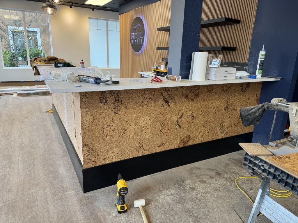 From concrete cuts to cork finishes — the bar coming together, complete with cork sourced from the same Portuguese producers who make wine corks.